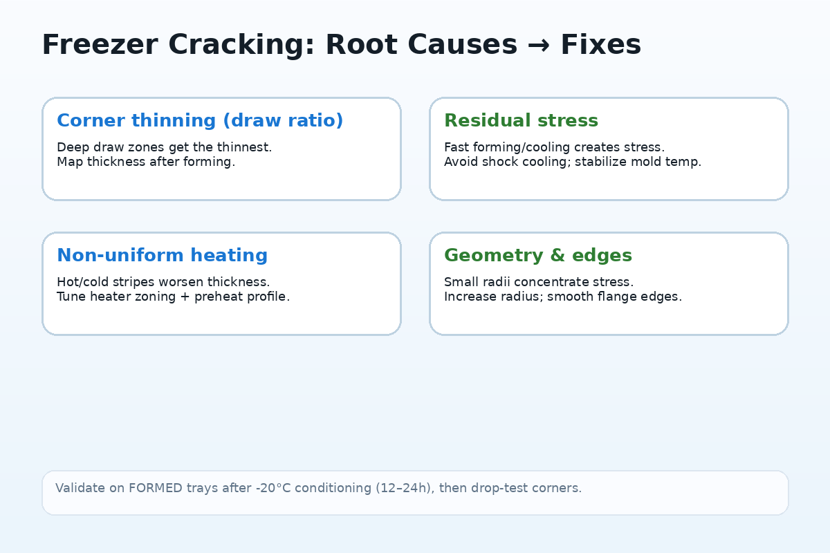• Freezer cracking (often at corners / deep-draw zones)