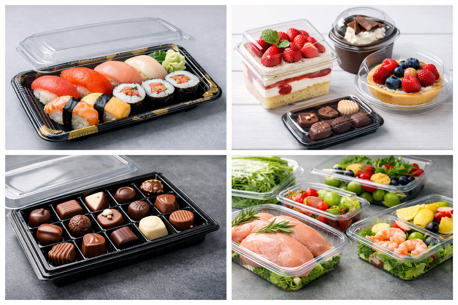 Application: sushi trays, dessert clamshells, chocolate inserts, meat/MAP trays, dairy cups, etc.
