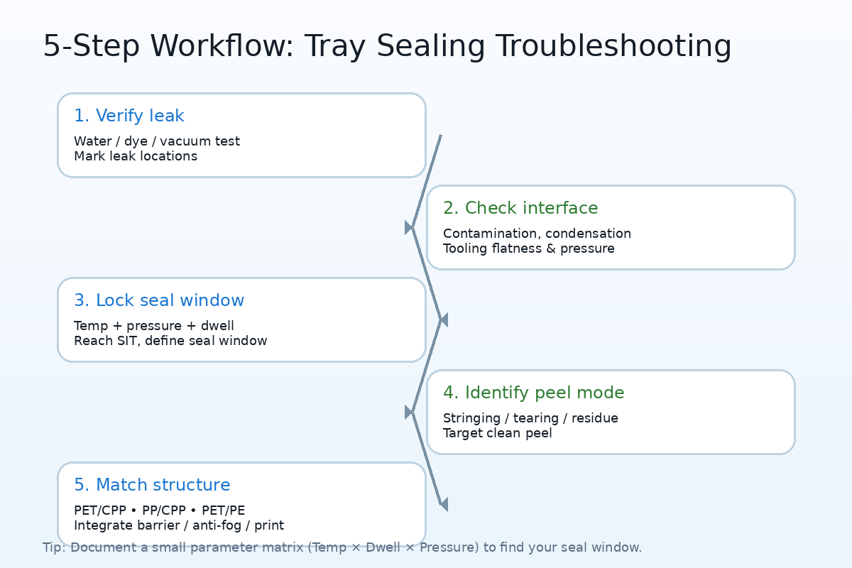 • Most tray sealing and easy-peel issues come from incomplete specs, unstable sealing parameters (temperature/pressure/time), contamination/wrinkles, and mismatch between tray structure and lidding system—not simply “bad material.”